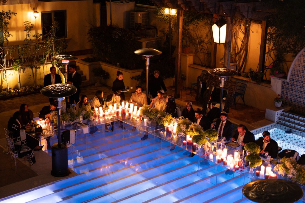 Flush plexiglass pool deck with lights in the water and clear ghost tables.